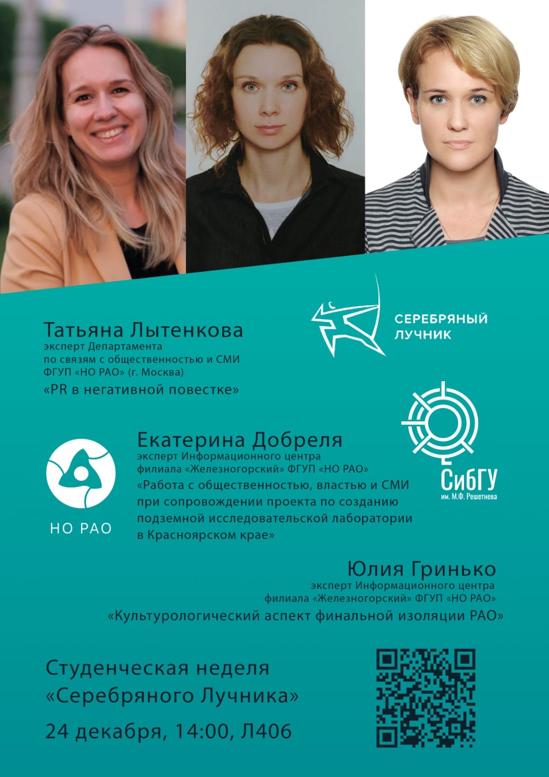 На студенческую конференцию пригласили трех представителей Национального оператора по обращению с РАО: эксперта департамента по связям с общественностью и СМИ Татьяну Лытенкову (выступала онлайн), экспертов Железногорского филиала предприятия Екатерину Добреля и Юлию Гринько.